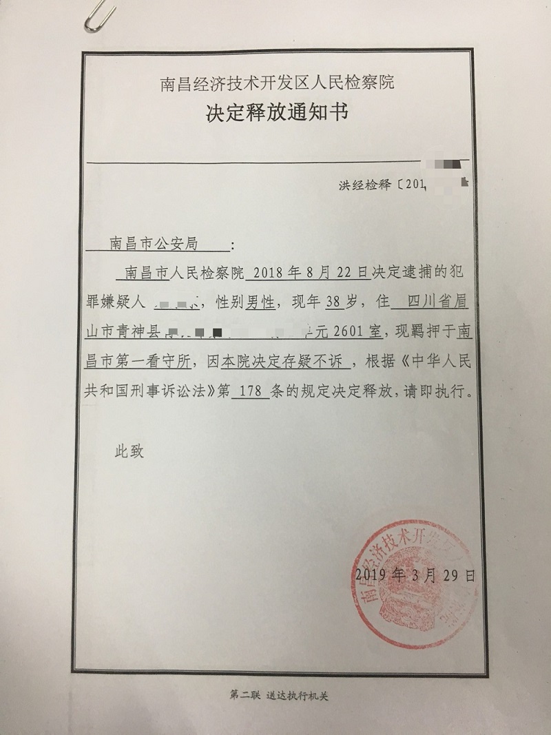 第二次退侦一个月后,案卷如期移送经开区检察院了,两次退侦均已用完。到了最关健的时候了,笔者再次去检察院阅补侦案卷,发现补侦案卷仍无有罪证据。笔者甚是欣喜,将好消息告知了家属,同时准备向检察院提交《不予起诉法律意见书》,辩护意见提出本案经贵院两次退回公安机关补充侦查,公安机关认定宋某某涉嫌假冒注册商标罪仍然事实不清、证据不足,恳请贵院依法作出不予起诉决定免于追究宋某某的刑事责任,检察官答复要将我的意见提交检委会讨论后再做决定。听到这个消息后,笔者觉得此案极有可能不诉。终于在2019年3月29日一个阳光明媚的下午,笔者接接到宋某某的电话,听到其释放的好消息,笔者内心如释重负...